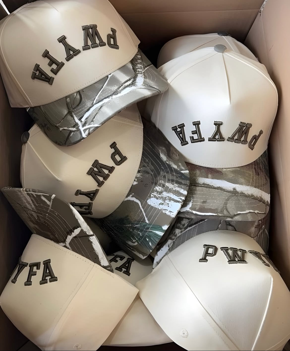 The hat EVERYONE is raving about ! The camo bill. The khaki color. The upside down, lifted, embroidered PWYFA font. GREAT quality. What more can you ask for?!?!