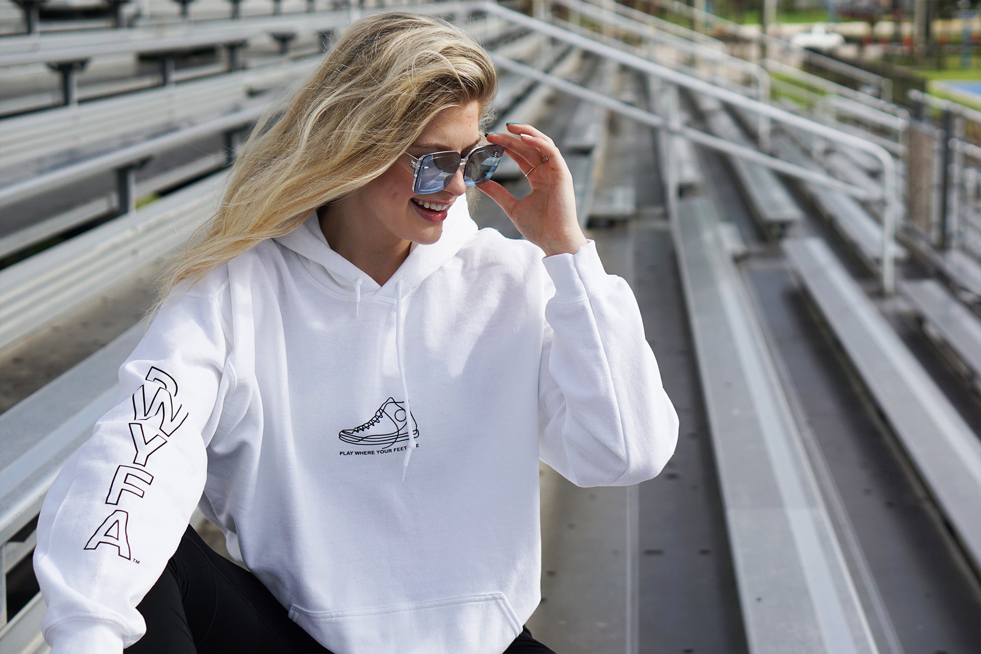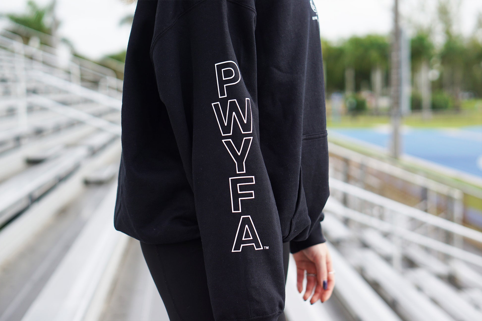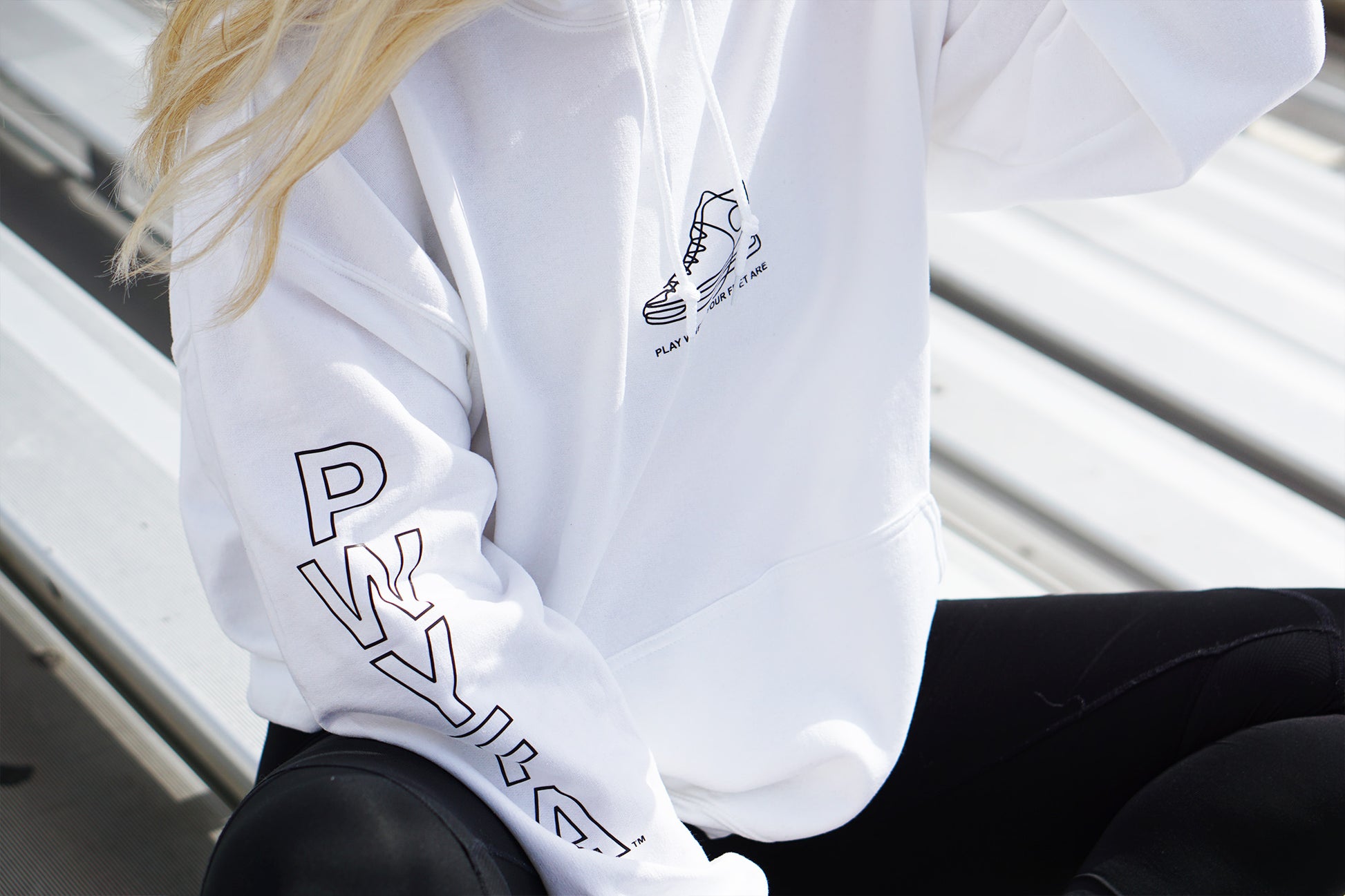 PWYFA Play Where Your Feet Are™ sweatshirt with shoe logo on front, vertical hollow "PWYFA" logo on right sleeve. Empty back.