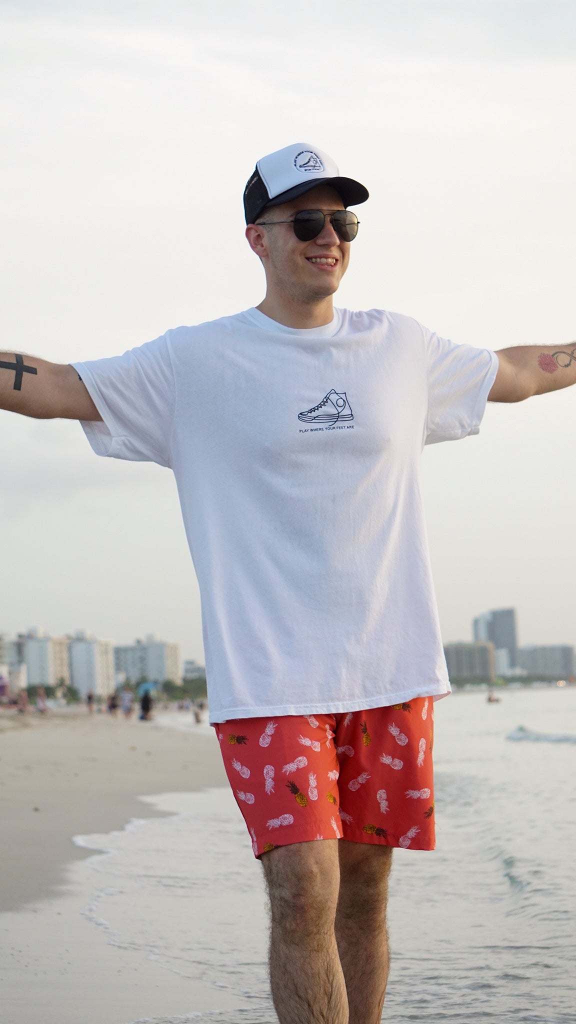 PWYFA Play Where Your Feet Are™ Sneaker logo t-shirt, modeled after our fan-favorite sweatshirt.
