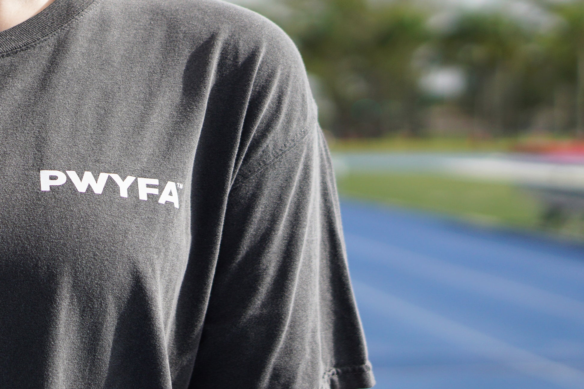 PWYFA Play Where Your Feet Are™ Variety Font T-shirt. Bold statement on the back, simple pocket logo on the front.